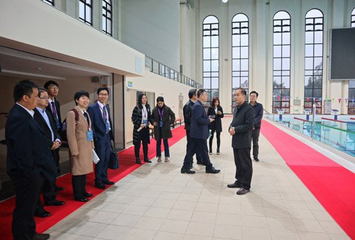 图为大家在跳水游泳馆参观