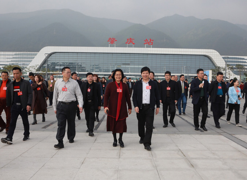 图为谢建平(前排中)随人大代表团赴肇庆火车站参观