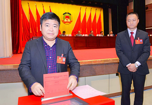 图为莫秀全在政协大会会场投票