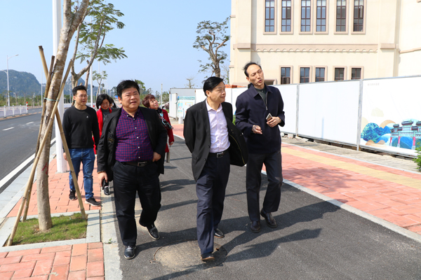 图为李尧坤(左)在听取莫秀全介绍校园发展规划