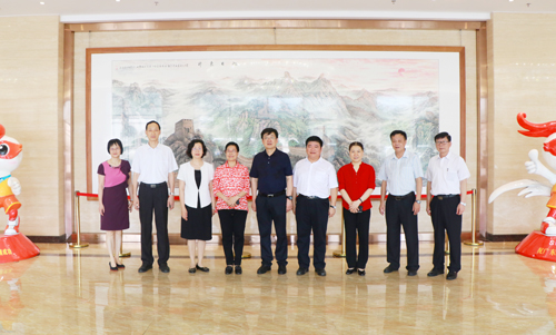 图为谢俐(中)、那佳(左三)、陈宣群(右三)与beat365领导在体育馆合影留念