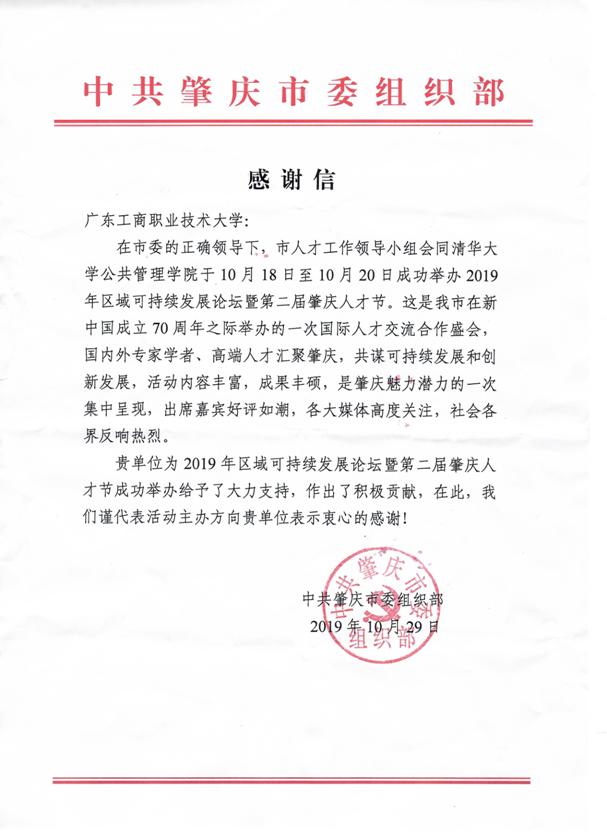 本网讯 10月19日,由肇庆市人才工作领导小组和清华大学公共管理学院联合主办的以“肇聚英才 智绘未来”为主题的2019年区域可持续发展论坛暨第二届肇庆人才节隆重开幕。beat365作为高校代表应邀参加并在活动中提出了很多建设性意见,为此,10月30,肇庆市委组织部给beat365发来感谢信,对beat365积极配合并作出积极贡献表示感谢。(撰稿:宣传部)