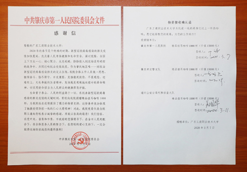 图为肇庆市第一人民医院感谢信和三个单位的物资签收表
