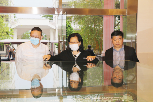 图为李挺(左)在行政楼沙盘前听取谢建平(中)和莫秀全(右)介绍学校总体发展规划