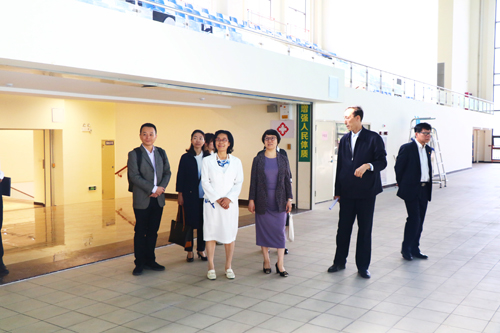 图为专家组在谢建平(前左二)、和飞(前右一)等陪同下参观体育馆