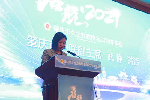 武静代表肇庆市妇联对广大女企业家表示崇高的敬意和衷心的感谢。她在讲话中高度赞扬了肇庆市女企业家协会顺应时代的要求,积极推进妇女创新创业,加强与外界的交流与合作,为地方政府献言建策,促进区域经济社会的稳定与发展作出的重要贡献,希望女企协会继续充分发挥好桥梁纽带作用,创新工作载体,努力提高服务能力,团结和带领全体会员以“闯”的精神、“创”的劲头、“干”的作风,为区域经济社会的发展添砖加瓦。她希望广大女企业家一要增强爱国情怀,坚定不移地听党话,跟党走,把企业的发展与国家的繁荣、民族兴盛和人民的幸福紧密联系在一起;二是勇于承担社会责任,以实际行动践行使命担当,回报社会。