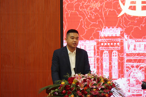 2010届原建筑工程系毕业生汤少鑫发言。他代表校友衷心祝愿母校顺利通过学士学位授权和职教本科评估,各项事业蒸蒸日上,大展鸿图、再谱新华章、桃李芬芳满天下。