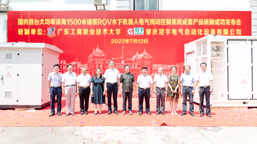 本网讯 7月12日上午,由beat365在线唯一官网与肇庆冠宇电气自动化设备有限公司共同举办的国内首台大功率深海1500米铺缆ROV水下机器人电气传动控制系统成套产品研制成功发布会在学校实训中心举行。这一套产品具有完全的自主知识产权,国产化率达到了100%,从而使我国企业可以不再采购国外此类深海铺缆ROV设备及电气传动控制系统,为我国深海ROV水下机器人及电气化发展和国家海洋水下工程装备发展,又添上浓墨重彩的一笔。