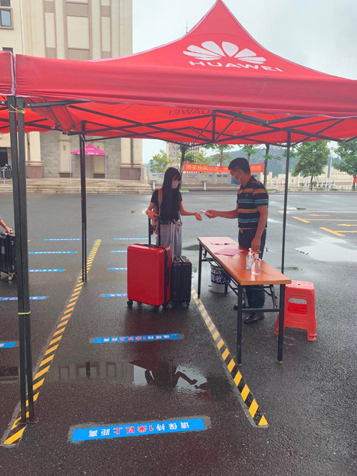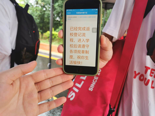 报到现场秩序井然,同学们按照学校规定的流程,有序地进行洗手、体温检测、核查“两码”、核对身份信息,然后乘坐接送专车返回宿舍。