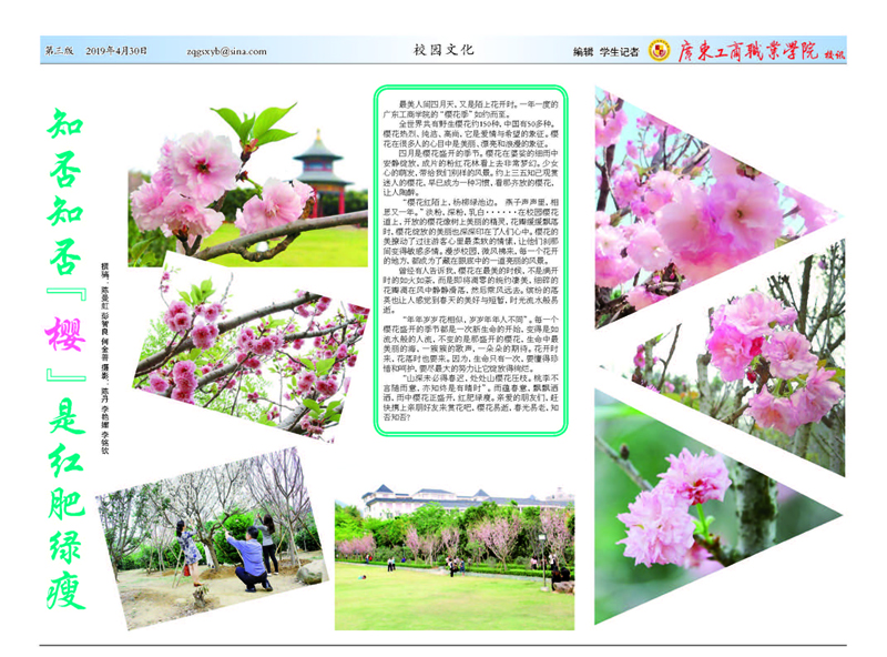 本网讯 近日,由广东高校校报研究会主办的“2019年度广东高校校报好新闻评选”结果揭晓,beat365共有三项作品获奖,其中,学子杨璇杏设计的“beat365在线唯一官网校讯2019年第七期第三版”获得版面类二等奖;韩治国老师撰写的《beat365在线唯一官网获批》 获得消息类三等奖;学子陈曼虹、彭智良、何金善撰写的《知否知否,“樱”是绿肥红瘦》获得标题类三等奖。(供稿:宣传部)