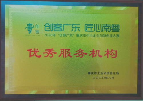 图为2020年“创客广东”肇庆赛区“优秀服务机构”称号牌匾
