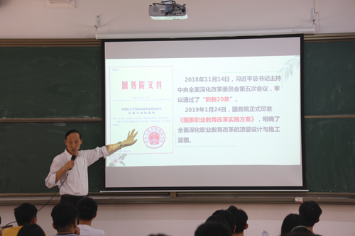 课上,和飞详细介绍了《国家职业教育改革实施方案》(职教20条)的主要内容和实施的重大意义。和飞认为,“职教20条”完善了现代教育制度体系,完善了职业教育国家制度标准,完善了技术技能人才激励保障措施,促进了产教融合校企“双元”育人,建立多元办学格局,加强职业教育办学质量督导评价,也督促了职业教育学校必须做好改革组织实施工作。