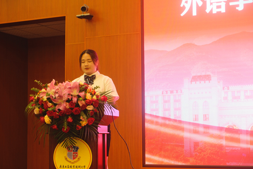 外语学院2018级学子吴丽莹代表毕业生对三年来学校老师们的陪伴、教导和照顾表示衷心的感谢,表示将牢记母校和老师们的谆谆教导,以“重知识、更重能力、尤重品德”的校训作为动力,在各自的岗位上努力工作,用最豪迈最稳重的步伐向美好的未来努力奋进。