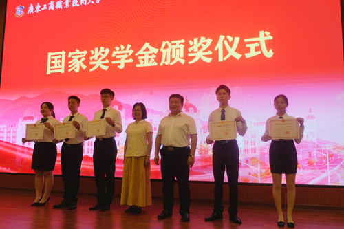 图为谢建平、莫秀全共同为国家奖学金获得者颁奖