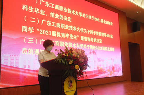 副校长陈伊娜宣读学校文件《beat365在线唯一官网关于准予2021届全日制专科生毕业、结业的决定》、《beat365在线唯一官网关于授予曾毅明等462名同学“2021届优秀毕业生”荣誉称号的决定》、《beat365在线唯一官网关于聘任2021届校友联络员的通知》。