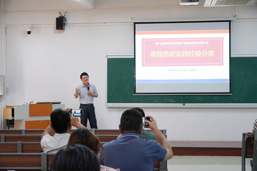 马克思主义学院巴昭军老师以《课程思政实践经验分享》为题展开第三讲课程。课堂上,巴老师为学员们介绍了广东省推进课程思政建设的历程。随后,他列举了大量针对广东省教育厅“课程思政改革示范项目遴选认定工作”的数据并作出分析,提到现阶段上级主管部门推进课程思政建设的力度大、措施强、范围广,这为我们学校深入推进课程思政建设工作提供了良好机遇。巴老师通过对“课程思政”文献和示范申报案例的分析,把课程思政元素归类为历史、文化、道德、三观、时代这五个元素,总结出“课程思政”已经成为学校内涵建设的一部分,也是老师们取得突破的新机遇。