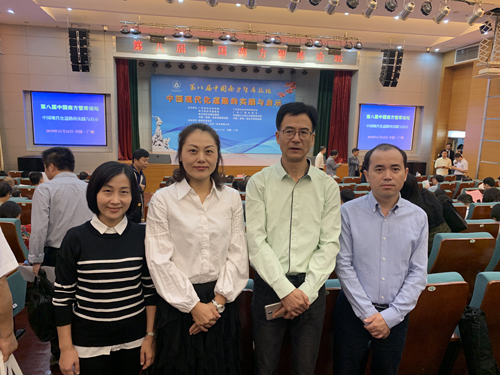图为韩治国(右二)、王子飞(右一)、梁伟莹(左一)、朱丽娜(左二)在大会会场合影留念