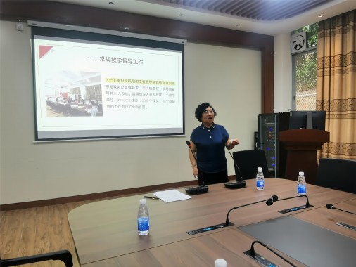 主任王亚芹首先介绍了本学期新聘任的5位兼职督导。随后,她从常规教学督导工作、评建工作、督导在教学管理中发挥的作用及近3年教学事故解析等方面对上学期整体督评工作开展情况进行了总结汇报。同时,就目前常规督导工作中存在的问题提出了要求。她指出,学校正在飞速发展,办学条件越来越好,学校环境越来越美,教学质量的提高必须与之相匹配。作为学校教学督导队伍的一员,要努力提升自身的综合素养,加强相互沟通。要实现“督”与“导”有机结合,引导教师提升课堂教学质量的主动性、积极性和投入教学的使命感。
