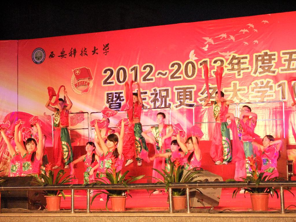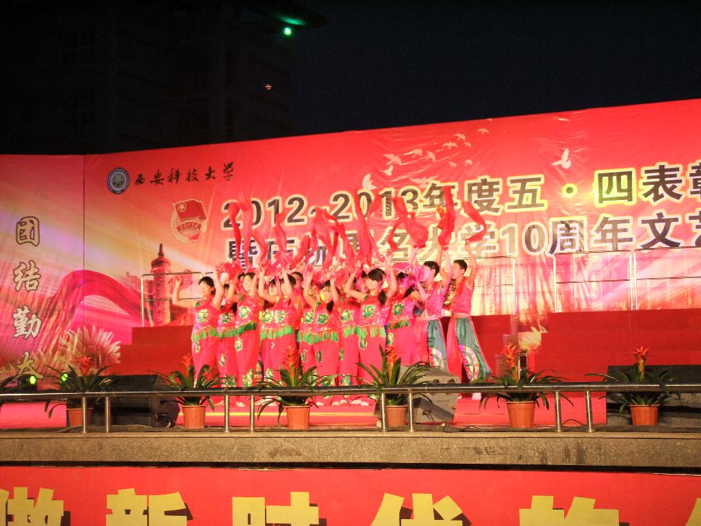 5月18日晚,我校2012—2013年度五四表彰大会暨庆祝更名大学十周年文艺汇演在我校临潼校区明德广场隆重举行。校各级领导、各学院(部)分管学生工作的书记,临潼校区全体辅导员、学生代表共4000余人参加了本次活动。机械学院的精彩演出赢得了全场热烈的掌声。 此次文艺汇演共分为“信仰的力量”、“多彩的生活”、“青春的使命”三个篇章。汇演在歌舞《五月的鲜花》中拉开帷幕。当进行到“多彩的生活”篇章时,一曲响亮的《开门红》吸引了全场的注意,我院秧歌队在观众的惊叹声中登台亮相,他们用热情欢快的秧歌舞展现出了机械人的青春活力,并赢得了最热烈的掌声。 晚会在《走向复兴》的旋律中落下帷幕,与会领导上台祝贺演出成功,并与演出人员合影留念。