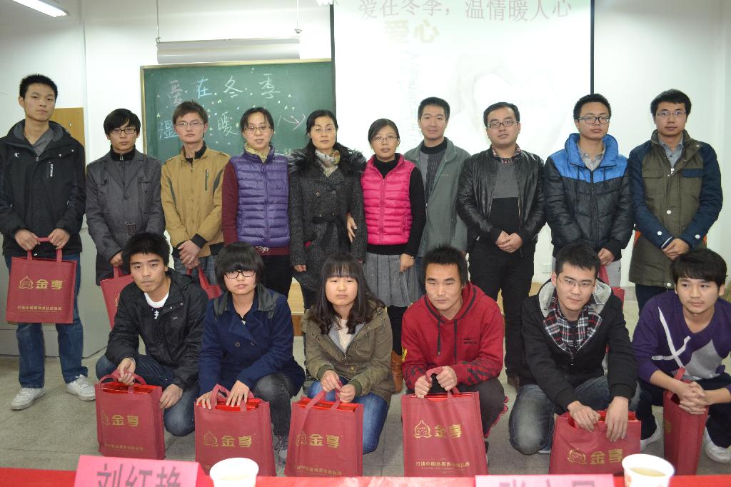 根据活动流程,程鹏老师首先致辞,并宣布了此次活动的正式开始,院团委书记陈霂老师代表发言,介绍本次活动的目的及意义,表达我院对贫困生的真切关怀;随后由贫困生代表发言,感谢学院对贫困生的热切帮助;紧接着,在资助部的组织下,六位老师为贫困生代表发放物品并合影留念。针对本次活动,校资助管理中心刘红艳老师也做了重要讲话,她对我院资助工作的表示赞许,对此次活动给予了高度评价,并鼓励贫困学生在面对困难的时候要有积极乐观的心态,对生活充满信心自觉培养个人能力,要有感恩意识,努力学习,把内心的感动转化为学习的动力来回报学校回报社会。最后,由程鹏老师总结发言并宣告此次活动圆满结束。