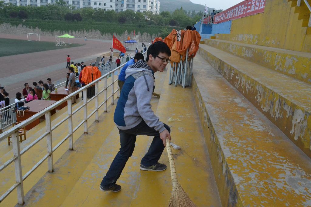 为了增强大学生参加的公益活动的意识,弘扬志愿者精神,培养吃苦耐劳品质,4月24日下午,在我校24日的运动会赛事结束后,我院组织部分学生做了义务劳动。参加义务劳动的同学等观众台上的人员全部撤离后,迅速清理台上台下的垃圾,使田径场在短短的几分钟内变得异常干净。