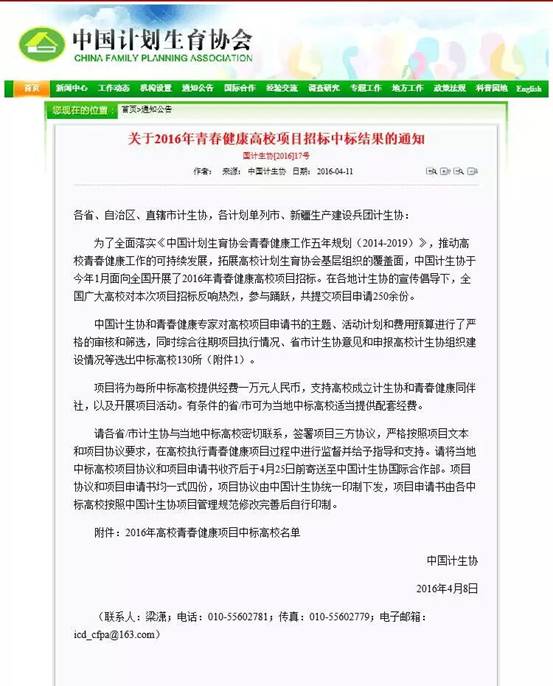 近日,中国计划生育协会公布了2016年青春健康高校项目的中标高校名单。经过市、省、国家三级计划生育协会的严格审核、筛选,最终我院分团委组织申报的“青春健康不任‘性’”项目成功中标,成为陕西省高校项目中标的9所高校之一。