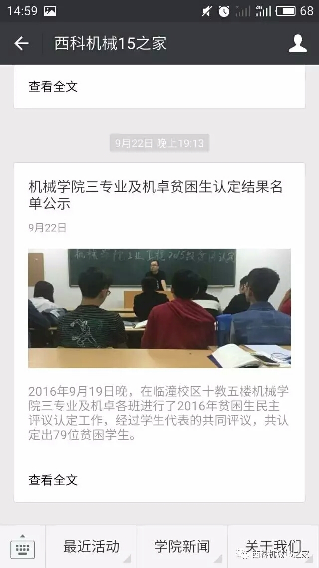 开通运行了“西科机械15之家”微信平台,展示、宣传年级工作,推送学生日常管理的相关制度、评优结果等信息60余条,如:团日活动、辩论赛、一二九大合唱、女生座谈会、志愿者活动等,形成线上线下的思想政治教育工作模式。