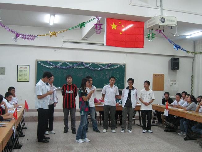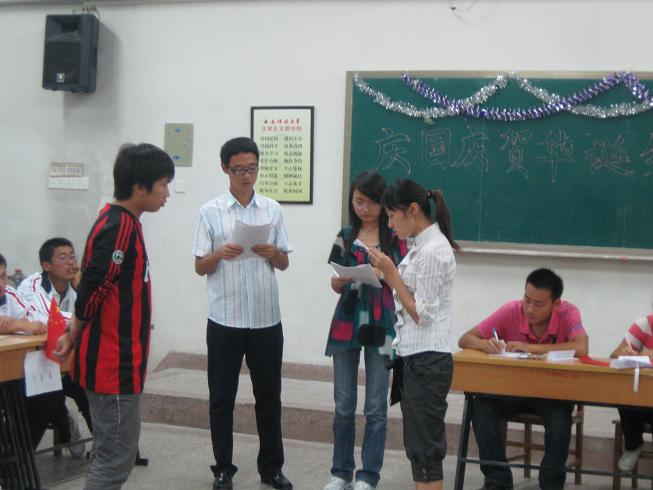 10月5号,闯过预赛的09级车辆和工业代表队,08级车辆和机电代表队,07级工业和机设1、2班代表队。参加了在3教学楼314举行的决赛。机械学院团委书记陈霂和辅导员张耿、张立显观看了决赛。此次决赛竞答题的内容主要与建国60周年以来我国的历史、经济发展有关。题目类型也非常有趣,包括必答选择题、抽签题、填空题、简述题。比赛中同学们积极竞答,展现出自己丰厚的知识底蕴,同时队内互相帮助,团队合作默契。最后,经过激烈的“战斗”车辆08级的同学获得冠军。