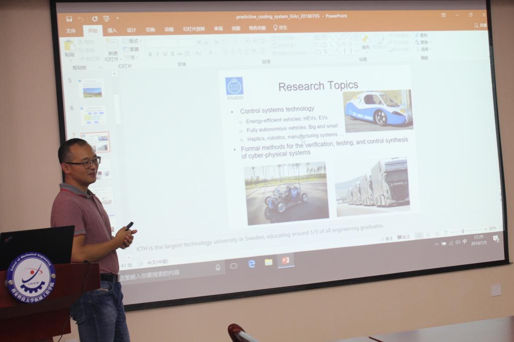 冯雷首先介绍了瑞典皇家理工大学的基本情况和在机电研究领域取得的成果,诸如电动无人驾驶乘用车、无人驾驶卡车、3D/4D打印技术等。重点对电动汽车冷却控制系统进行了深入分析,尤其是模型预测控制方法。最后,冯雷教授就师生共同关心的相关学术问题做了交流讨论。