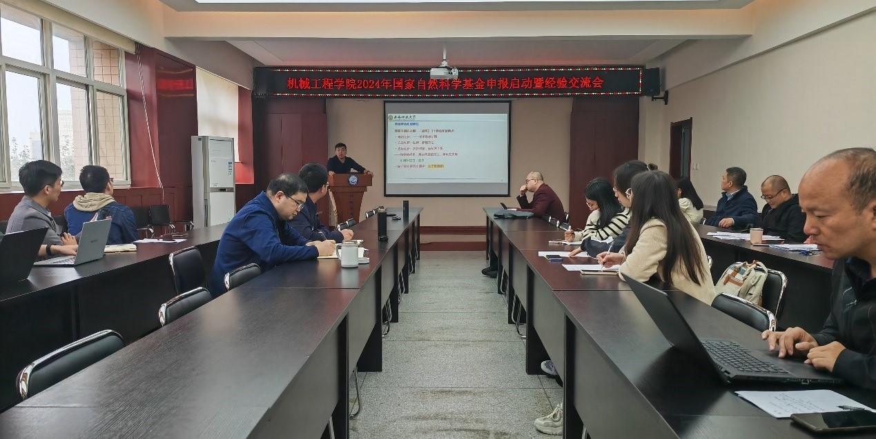 为进一步做好2024年度国家自然科学基金项目申报工作,提高基金申报质量,10月12日下午,机械学院在骊山校园学院320会议室召开2024年国家自然科学基金申报启动暨经验交流会,院长曹现刚教授以及学院申报基金教师代表30余人参加会议,会议由副院长毛清华教授主持。