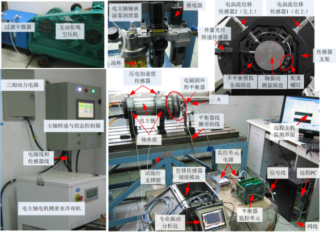 “高速精密机床电主轴智能动平衡系统”如图1所示,采用压电式加速度传感器和电涡流位移传感器检测主轴振动,采用光电反射式传感器测量主轴转速和相位,采用DSP+FPGA开发控制器,平衡作动器采用电磁-永磁混合驱动方式、配重块进行等半径极坐标运动,双盘合成等效平衡矢量,基于单平面影响系数自适应方法进行控制决策。图1所示为系统在高速磨削电主轴上的应用示例。