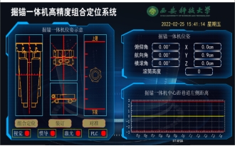 前置防爆相机和后置防爆相机分别面向前后固定于机身上;红外标靶固定于掘进机截割臂上;将激光指向仪固定于巷道顶部的锚杆上,毫米波雷达固定放在机身两侧,PLC与捷联惯导安装在防爆电控箱内。其中,前置防爆工业相机、红外标靶和防爆计算机构成截割头视觉测量系统,后置防爆工业相机与激光指向仪和防爆计算机构成掘进机机身位姿测量系统,捷联惯导用来获取掘进机实时姿态信息,毫米波雷达获取掘进机到截割断面煤壁的距离。图2、3分别为掘锚一体机高精度组合定位系统软件界面,及掘进机可视化自动截割软件界面。