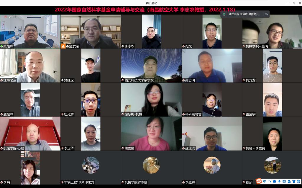 1月18日下午机械学院邀请南昌航空大学李志农教授,在线作了题为“如何把项目立项依据写到位”国家自然科学基金申请辅导报告,学院班子成员、各学科带头人及学术带头人等200余名师生参加了报告会。会议由副院长寇发荣主持。