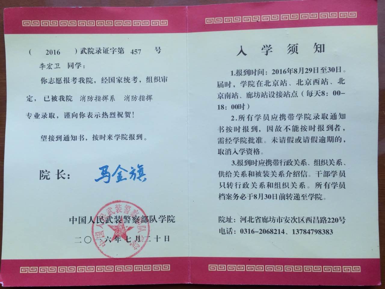 国防贡献,成就真我——我院参军入伍学生李宏卫考入军校