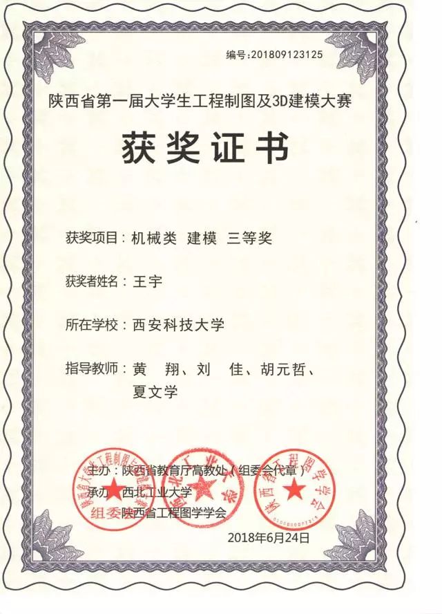 “陕西省第一届大学生工程制图及3D建模大赛” 于6月22至24日在西北工业大学举行。经过激烈角逐,张曦(机设1505)、王宇(车辆1501)、任众孚(机械类1712)、张磊(机械类1708)、刘拼瑶(机械类1713)荣获个人单项工程制图及3D建模共计八项,同时取得了机械类团体三等奖。