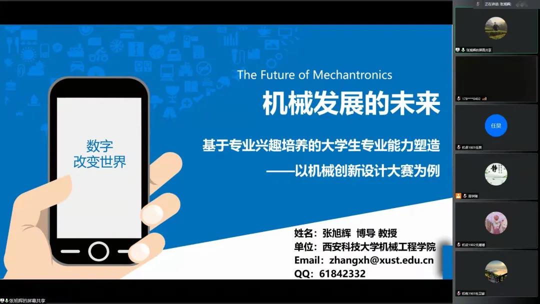 12月31日,机械学院院长张旭辉教授为全院学生送来了一份特殊的“元旦礼物”,一场主题为《机械发展的未来—基于专业兴趣培养的大学生专业能力塑造》的线上报告会及元旦祝福,温暖了每一位机械学子,报告会由机械学院