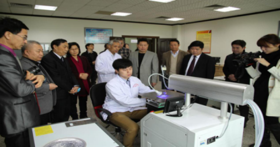 肇庆市高新区管委会主任陈家添(右三)在现场观摩激光打片演示